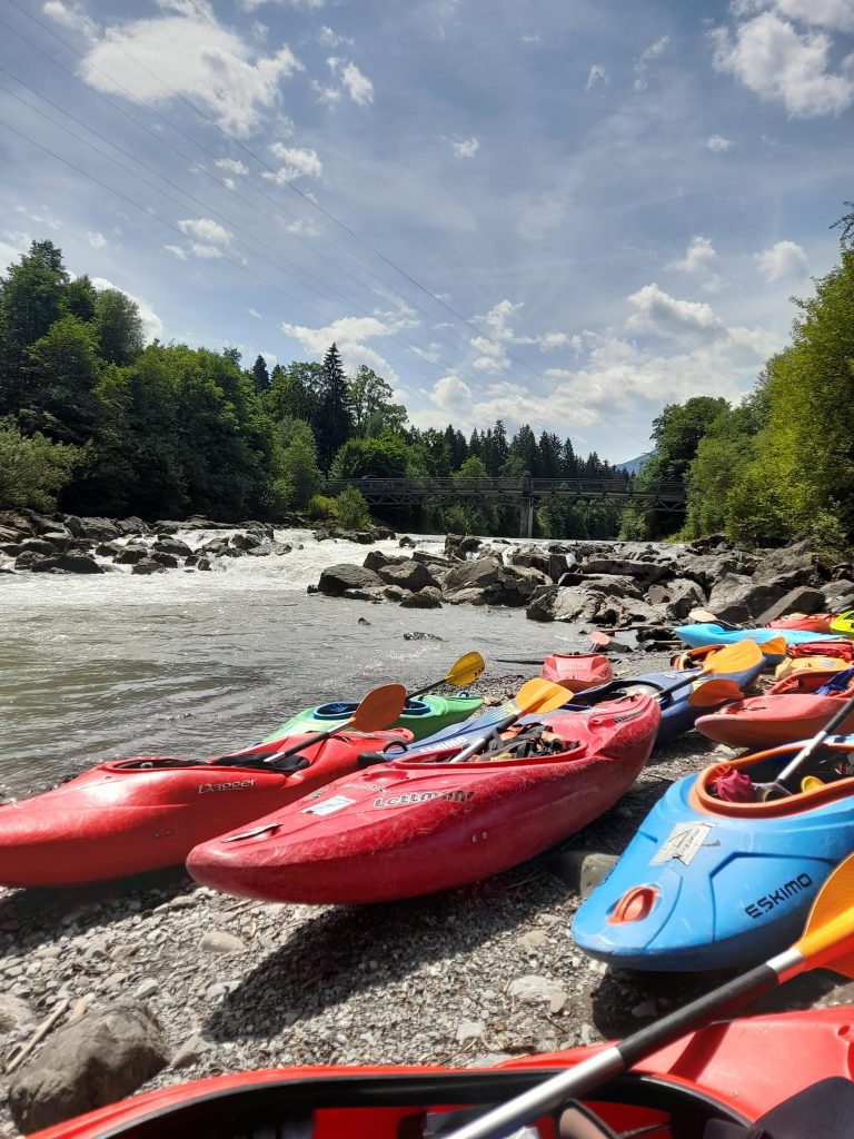 Am zweiten Tag ging es dann für alle, die sich bereit fühlten, auf die Iller bei Fischen. Hier konnten die frisch gelernten Techniken im bewegten Wasser angewendet werden. Für viele war es das erste Mal auf einem Fluss – dementsprechend groß war die Aufregung, aber auch der Stolz nach den ersten gemeisterten Stromschnellen.